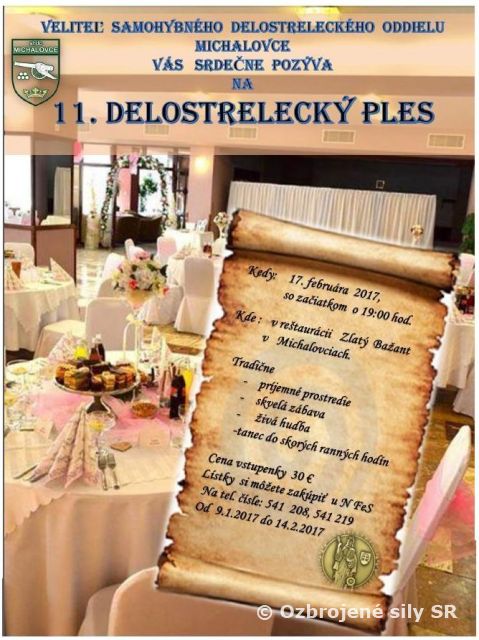 Veliteľ Samohybného delostreleckého oddielu v Michalovciach v zastúpení major   Stanislav ŠRAGA Vás  srdečne pozýva na 11. Delostrelecký ples, ktorý sa uskutoční 17. februára 2017 v reštaurácii Zlatý Bažant v Michalovciach. Delostrelecký ples je tradičným podujatím života oddielu a súčasťou michalovskej plesovej sezóny. Na plese Vás čaká príjemné prostredie a skvelá zábava do skorých ranných hodín.   Bližšie informácie je možné získať na telefónnom čísle 0960/ 541 244.